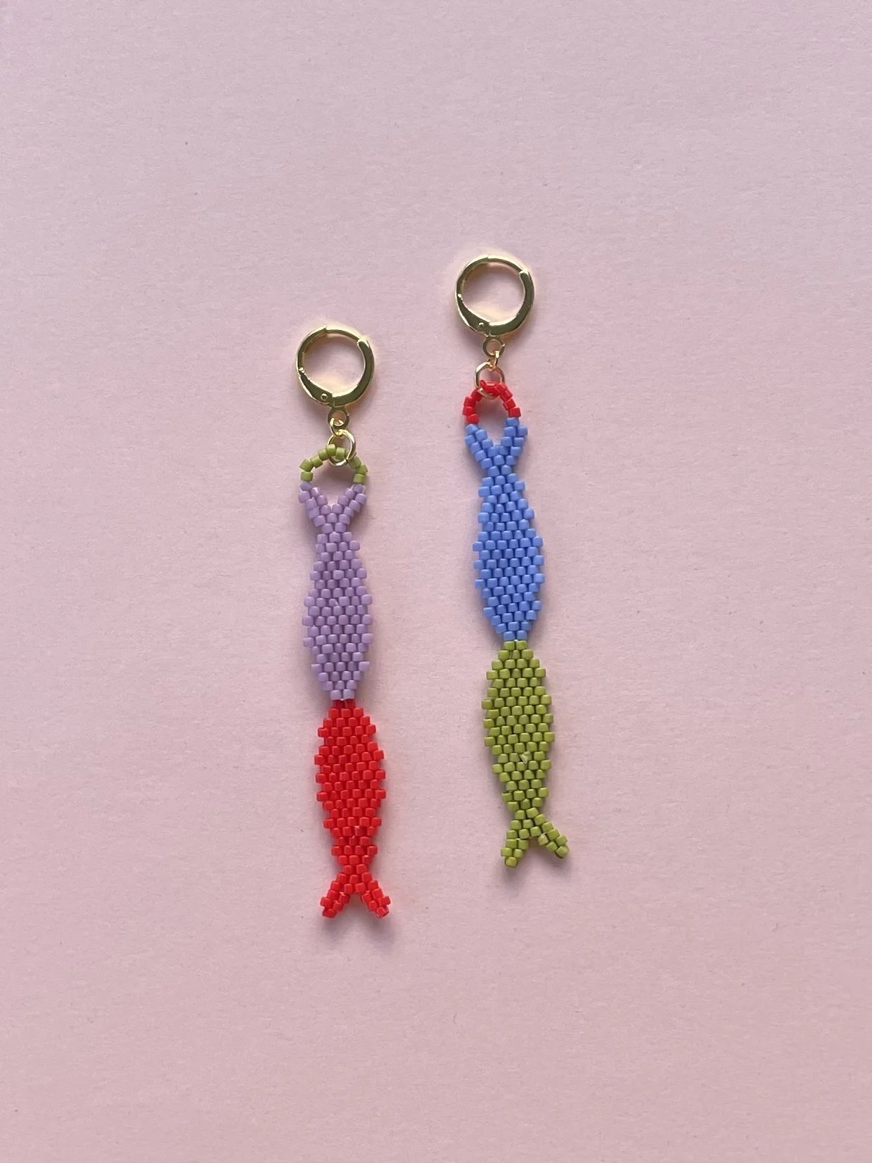 Shop › sardine friend earrings sardine friend earrings $82.00 color blocked sardines hand beaded with Japanese glass seed beads. gold filled hardware color blocked sardines hand beaded with Japanese glass seed beads. gold filled hardware Add To Cart Added!